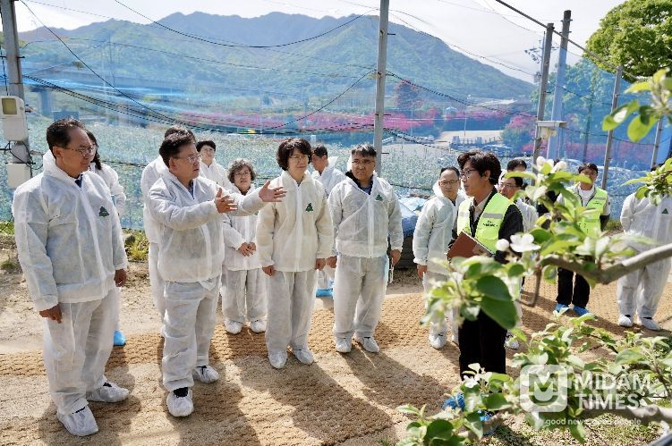 미담타임스 김준완 기자 | 경상북도농업기술원은 22일 사과 주산지 영주시에서 과수화상병 확산 방지를 위해 중앙·도 합동 개화기 약제 방제 추진 상황을 점검했다.