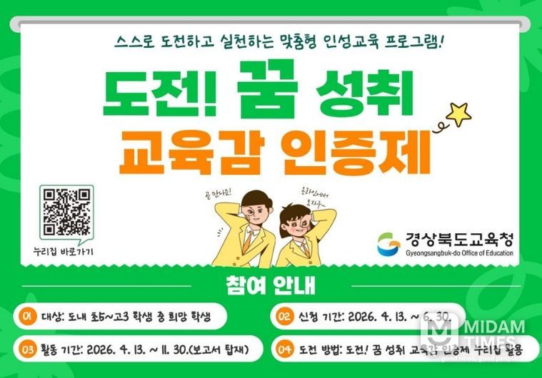 임종식 교육감은 “미래 사회는 정답을 찾는 능력보다 스스로 도전하고 경험을 통해 성장하는 힘이 더욱 중요하다”라며 “도전! 꿈 성취 교육감 인증제가 학생들에게 의미 있는 도전 기회를 제공하고, 자기주도적 성장을 이끄는 발판이 되도록 적극 지원하겠다”라고 말했다.