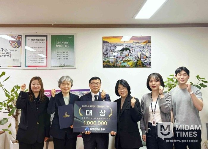 미담타임스 남혜영 기자 | 부산 중구는 2026년 치매관리 민관협력 우수사례 공모전에서‘소지역 맞춤형 기억동행, 중구형 치매보듬마을’사례로 대상을 수상했다고 밝혔다.