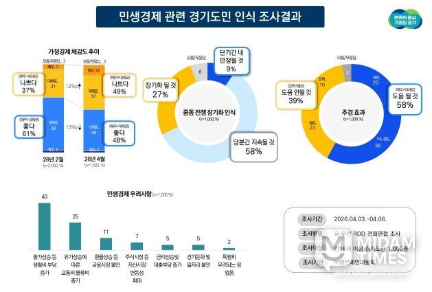 정두석 경기도 기획조정실장은 “가정 경제 형편이 두 달 만에 급격히 나빠졌다는 조사 결과는 현재 민생 현장의 어려움을 보여준다”며 “추경 예산이 빠르게 집행될 수 있도록 도의회와 긴밀히 협의하여 고유가와 고물가로 고통받는 도민들의 부담을 덜어드리도록 하겠다”고 밝혔다.