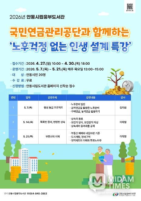 안동시립도서관 관계자는 “이번 특강은 시민이 막연하게만 느꼈던 노후 준비를 체계적이고 종합적으로 계획할 수 있도록 돕기 위해 마련했다”며 “가까운 미래를 진지하게 고민하는 신중년 세대의 많은 관심과 참여를 기대한다”고 전했다.