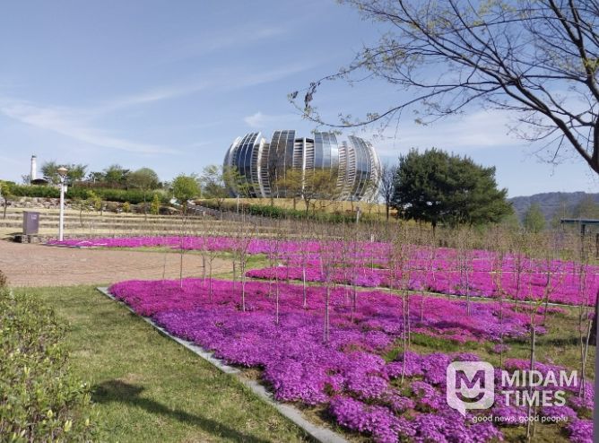 미담타임스 김준완 기자 | 상주시민의 힐링 휴식처인 중덕지 자연생태공원에 봄 향기를 가득 머금은 꽃잔디가 만개해 눈부신 보라색 빛을 발산하고 있다.
