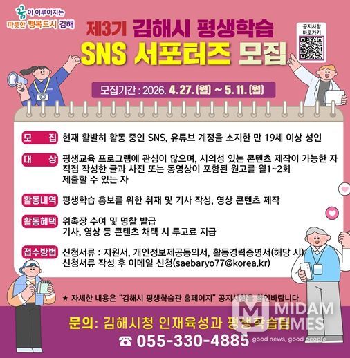 미담타임스 황명수 기자 | 김해시는 27일부터 5월 11일까지 제3기 김해시 평생학습 SNS 서포터즈를 모집한다.
