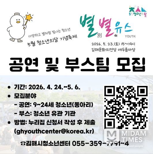 미담타임스 황명수 기자 | 김해시청소년센터는 청소년이 직접 기획하고 참여하는 2026년 청소년의 달 기념 축제 ‘별별유스’를 앞두고 공연 및 체험 부스 참가팀 모집에 나섰다고 밝혔다.