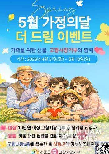 미담타임스 황명수 기자 | 하동군이 5월 가정의 달을 맞아 4월 27일부터 5월 10일까지 ‘고향사랑기부 더 드림 이벤트’를 진행한다.