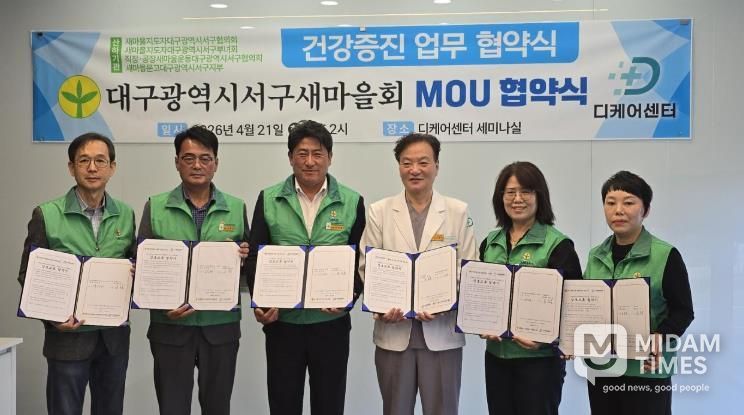 미담타임스 전해찬 기자 | 대구광역시서구새마을회는 지난 4월 21일 오후 2시, 디케어센터 세미나실에서 디케어센터와 서구새마을회지도자 및 가족의 건강증진과 복지 향상을 위한 상호협력 업무협약(MOU)을 체결했다.