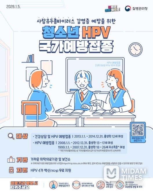 접종 대상자는 가까운 위탁의료기관 또는 보건소를 방문해 무료로 HPV 백신(HPV 4가)을 접종받을 수 있으며, 접종 가능 의료기관과 접종대상 해당 여부는 예방접종도우미 누리집을 통해 확인할 수 있다.