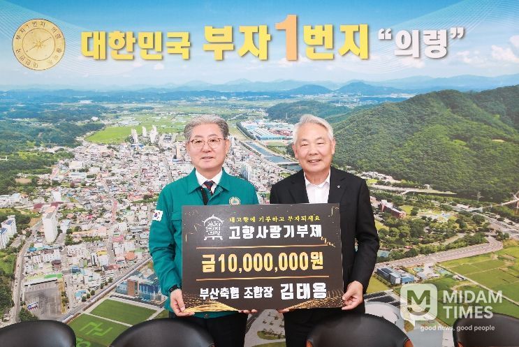 미담타임스 황명수 기자 | 의령군은 지난 21일 부산축협 김태용 조합장이 군을 방문해 고향사랑기부금 1,000만 원을 기탁했다고 밝혔다.