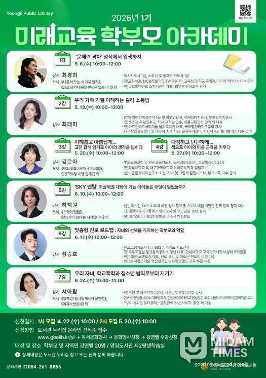 미담타임스 김준완 기자 | 경상북도교육청 영일도서관은 오는 5월 6일부터 학부모 및 지역주민을 대상으로 ‘2026 1기 미래교육 학부모 아카데미’를 운영하고 수강생을 모집한다.