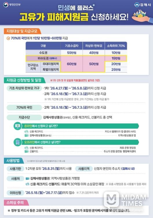 미담타임스 황명수 기자 | 김해시는 정부의 고유가 피해지원금 지급 사업에 따라 오는 27일부터 7월 3일까지 1차, 2차로 나눠 전 시민의 70%를 대상으로 지급한다고 23일 밝혔다.