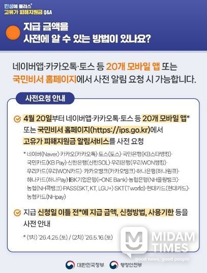 알림 서비스는 네이버, 카카오톡, 토스, 금융사 앱 등 국민 대다수가 이용하는 20개 모바일 앱과 국민비서 누리집을 통해 신청할 수 있다. 기존 이용자는 서비스만 추가하면 되며, 미가입자도 간단한 인증 절차를 거쳐 가입 가능하다.