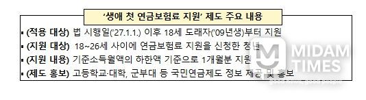 2027년부터 국민연금 납부 이력이 없는 18세 청년은 생애 첫 1개월분 연금보험료를 지원받는다. 지원 금액은 기준소득월액 하한액에 해당하는 보험료 전액으로, 약 4만 2천 원 수준이다. 2027년 1월 1일 이후 18세에 도래하는 2009년생부터 지원받을 수 있다.
