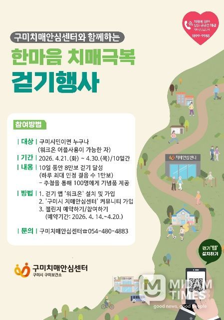 미담타임스 김준완 기자 | 구미시는 치매 예방과 시민 건강 증진을 위해‘2026년 한마음 치매극복 걷기 챌린지’를 운영한다. 이번 챌린지는 시민 누구나 참여할 수 있는 비대면 걷기 프로그램으로 진행된다.
