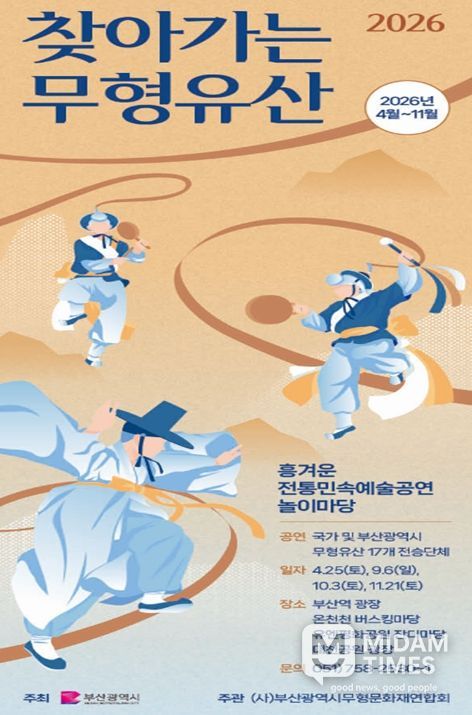 미담타임스 남혜영 기자 | 부산시는 무형유산 전통 민속예술의 가치를 확산하고, 신명 나고 흥겨운 전통 민속예술 공연으로 시민들의 삶에 활력을 불어넣기 위해 '2026 찾아가는 무형유산' '전통민속예술공연 놀이마당'을 개최한다고 밝혔다.