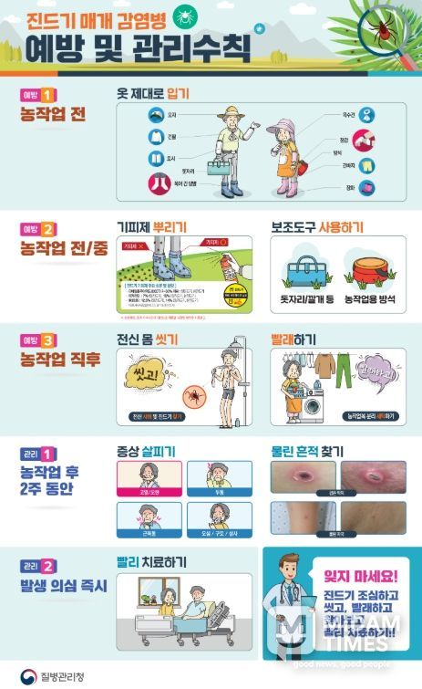 진드기 매개 감염병 예방 수칙으로는 ▲야외 활동 시 긴 소매, 긴 바지, 모자, 장갑, 장화 등을 착용하여 피부 노출 최소화 하기 ▲기피제 사용하기 ▲휴식 시 돗자리 사용하기 ▲ 야외 활동 후 즉시 샤워 및 세탁하기 등이 있다.
