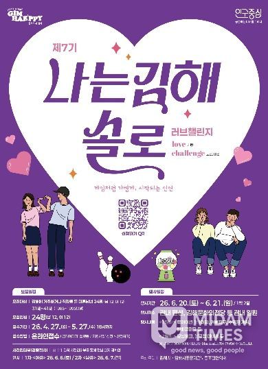 미담타임스 황명수 기자 | 김해시는 오는 6월 20일부터 21일까지 1박 2일 일정으로 관내 펜션과 김해문화의전당 등에서 진행하는‘제7기 나는 김해솔로-러브챌린지’참가자 24명(남·여 각 12명)을 모집한다고 24일 밝혔다.