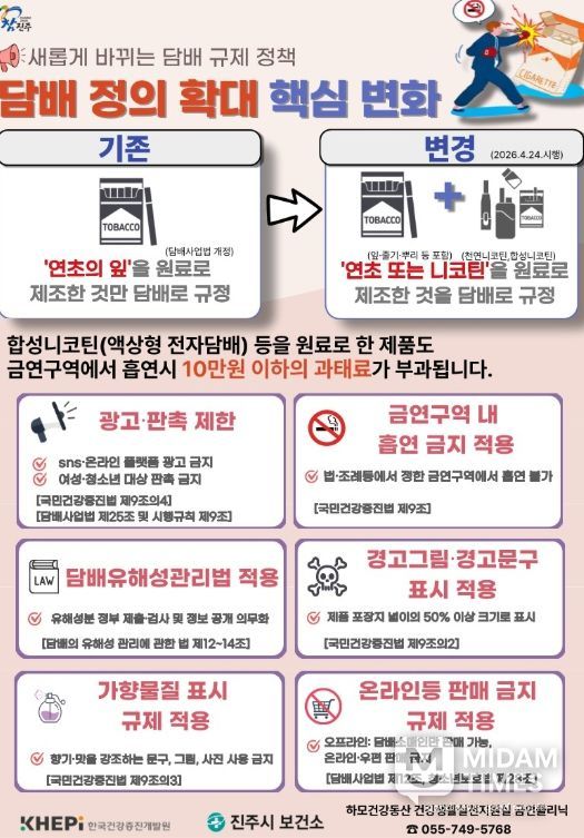 미담타임스 황명수 기자 | 진주시는 담배의 정의를 확대한 '담배사업법' 개정안이 24일부터 시행됨에 따라 금연 구역에 대한 지도 점검을 강화한다고 밝혔다.