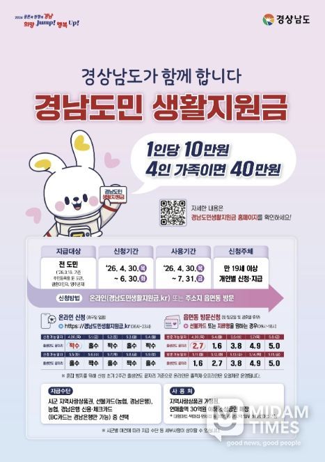 경남도민 생활지원금은 전 군민(2026년 3월 18일 주민등록 기준)을 대상으로 4월 30일부터 6월 30일까지 지급된다. 지원금액은 1인당 10만 원이며, 지급수단은 창녕사랑상품권, 신용·체크카드(농협-경남은행), 선불카드 등이다.