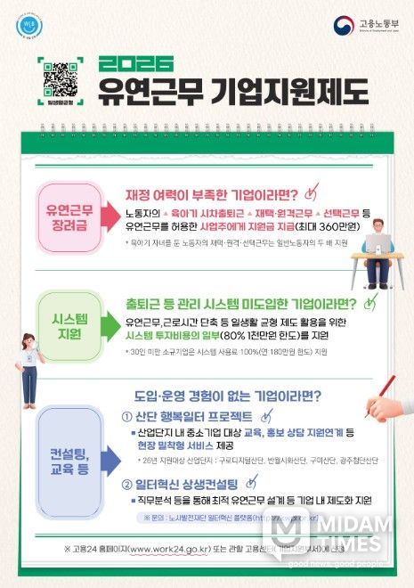 다만, 중소기업의 경우 인력 운영 부담, 시스템 구축 비용, 보안 문제 등으로 유연근무 도입과 활용에 어려움이 있는 것도 현실이다. 이에 정부는 기업 여건에 맞는 맞춤형 지원을 통해 민간 확산을 적극 뒷받침하고 있다.