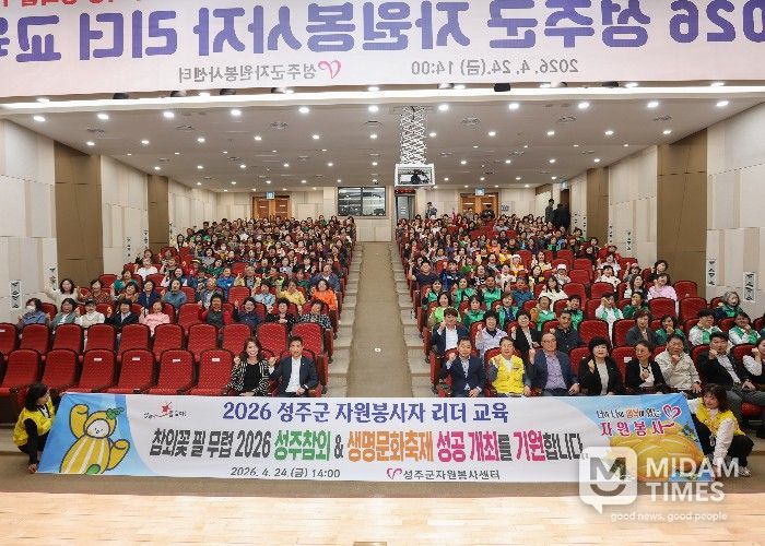 미담타임스 김준완 기자 | 경북 성주군자원봉사센터는 지역 공동체의 따뜻한 변화를 이끄는 자원봉사 리더들을 한자리에 모아 의미 있는 교육의 장을 마련했다. 4월 24일 성주군청 대강당에서 열린 '2026 성주군 자원봉사자 리더 교육'은 단순한 역량 강화 교육을 넘어 나눔과 연대의 가치를 되새기고, 다가오는 지역 대표 축제를 함께 준비하는 결속의 자리로 깊은 울림을 전했다.