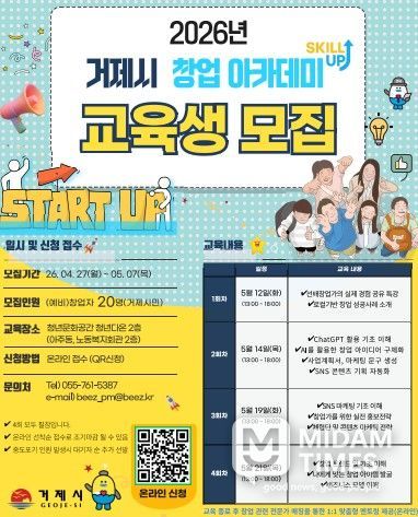 미담타임스 황명수 기자 | 거제시는 지역 내 예비 창업자와 일반 시민이 일상 속 아이디어를 창업 으로 구현해볼 수 있도록 돕는'2026년 거제시 창업 아카데미' 교육생을 오는 4월 27일부터 모집한다.