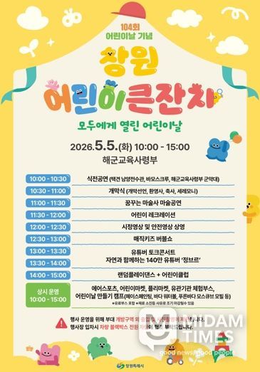 미담타임스 황명수 기자 | 창원특례시는 오는 5월 5일 제104회 어린이날을 기념하여 해군교육사령부(진해구)에서 '창원 어린이 큰잔치'를 오전 10시부터 오후 3시까지 개최한다고 밝혔다.