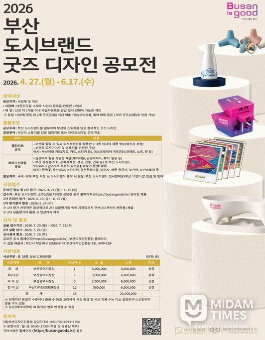 미담타임스 남혜영 기자 | 부산시와 (재)부산디자인진흥원은 오늘(27일)부터 6월 17일까지 '2026 부산 도시브랜드 굿즈(상품) 디자인 공모전'을 개최한다고 밝혔다.