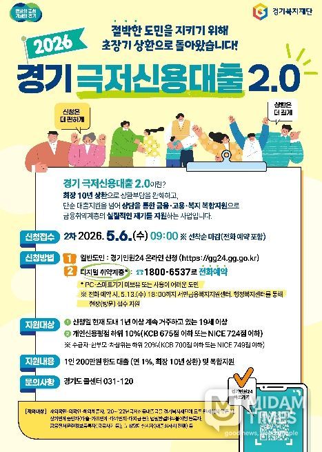 미담타임스 정주환 기자 | 경기도가 5월 6일 오전 9시부터 금융취약계층의 생활 안정을 지원하는 ‘경기 극저신용대출 2.0’ 2차 접수를 시작한다.
