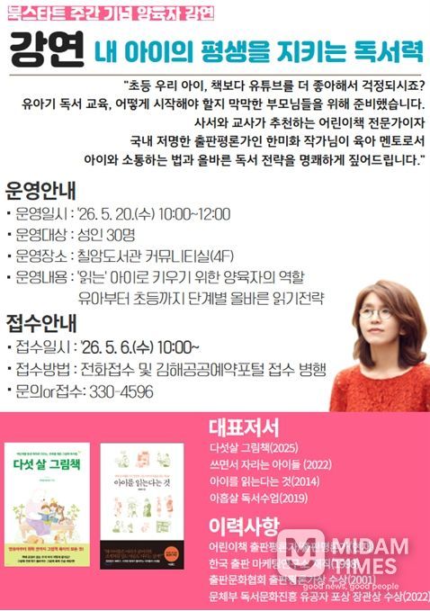 미담타임스 황명수 기자 | 김해시 칠암도서관은 북스타트 주간을 맞아 올바른 독서 양육의 방향을 제시하기 위해 내달 20일 ‘내 아이의 평생을 지키는 독서력’ 강연을 개최한다고 27일 밝혔다.