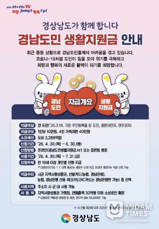 미담타임스 황명수 기자 | 하동군은 군민 생활 안정과 지역경제 활성화를 위해 전 군민을 대상으로 ‘경남도민 생활지원금’을 지급한다고 밝혔다.