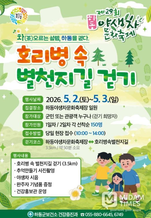 하동군 보건소는 ‘제29회 하동야생차문화축제’를 맞아 오는 5월 2일부터 3일까지 이틀간 ‘호리병 속 별천지길 건강걷기’ 행사를 개최한다고 밝혔다.