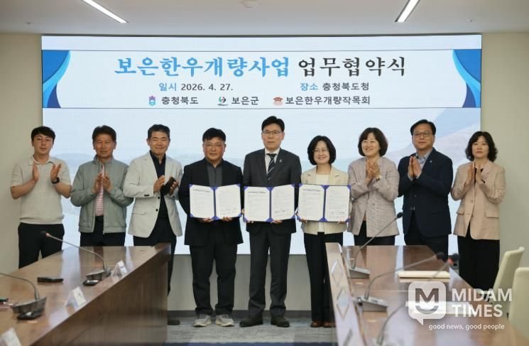 미담타임스 정인화 기자 | 충북 보은군은 27일 충북도청 여는마당에서 충청북도, 보은한우개량작목회와 함께 한우 개량 고도화와 우량 유전자원 확산을 위한 업무협약을 체결하고 보은한우 경쟁력 강화를 위한 추진 기반을 마련했다.