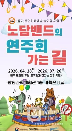 미담타임스 황명수 기자 | 창원특례시 창원과학체험관은 오는 4월 28일부터 7월 26일까지 1층 기획전시실에서 유아 대상 흡연 예방 놀이형 특별전시 ‘노담밴드의 연주회 가는 길’을 개최한다.