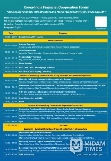 미담타임스 정주환 기자 | 금융위원회 이억원 위원장은 4월 19일~25일 4박 7일 일정으로 대통령의 인도·베트남 해외순방에 동행했다. 주요 일정으로는 한국 금융회사 해외진출 및 영업 확대 지원을 위한 고위급 정부회담, 금융중심지 육성 및 국경간 QR 결제망 연동 등을 위한 금융협력포럼 개최, 현지 금융회사·기업 간담회 등을 진행했다. 이번 방문은 고속 성장 중인 두 핵심 파트너 국가와의 ‘전략적 협력 고도화’라는 목표를 금융분야에서 적극 뒷받침하기 위해 마련된 것으로, 인도의 경우 금융위원장으로서는 첫 방문이다.