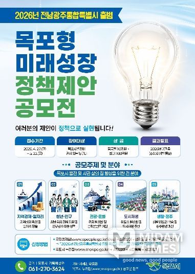 미담타임스 정인화 기자 | 목포시가 전남·광주 통합특별시 출범에 대비하고 지역의 미래 성장동력을 발굴하기 위해 ‘목포형 미래성장 정책제안 공모전’을 개최한다.