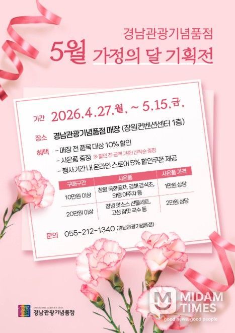 미담타임스 황명수 기자 | 경상남도는 ‘5월 가정의 달’을 맞아 경남관광재단이 운영하는 경남관광기념품점에서 4월 27일부터 5월 15일까지 약 3주간 풍성한 혜택을 담은 특별 기획전을 선보인다고 밝혔다.