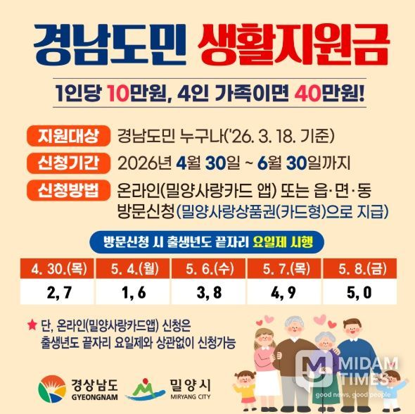 미담타임스 황명수 기자 | 경남 밀양시는 오는 4월 30일부터 시민 생활 안정을 지원하기 위한 ‘경남도민 생활지원금’ 신청을 받는다고 밝혔다.