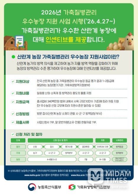 미담타임스 김준완 기자 | 농림축산식품부는 축산농가의 방역역량을 강화하고 가축전염병 발생을 사전 예방하기 위해 '가축질병관리 우수농장 지원사업'을 2026년 4월부터 본격 추진한다고 밝혔다.