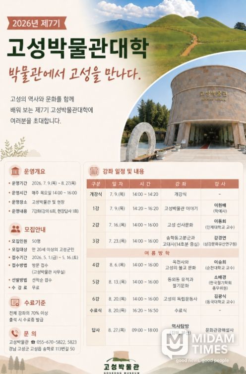 미담타임스 황명수 기자 | 고성군은 5월 1일부터 5월 16일까지 16일간‘제7기 고성박물관 대학’수강생을 모집한다.