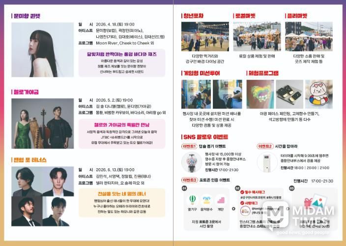 공연과 함께 청년포차, 로컬마켓 등 먹거리와 플리마켓이 운영되며, 스마트 관광 게임형 미션투어, 포토존 인증이벤트, 인생 두컷 촬영 등 다양한 참여형 프로그램도 마련된다.
