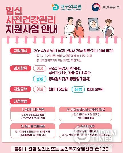 미담타임스 전해찬 기자 | 대구의료원 난임센터는 임신·출산에 장애가 될 수 있는 건강 위험요인을 조기에 발견하기 위한 ‘임신 사전건강관리 지원사업’ 참여의료기관으로 선정돼, 지역 주민의 건강한 임신·출산 환경 조성을 적극 지원한다.