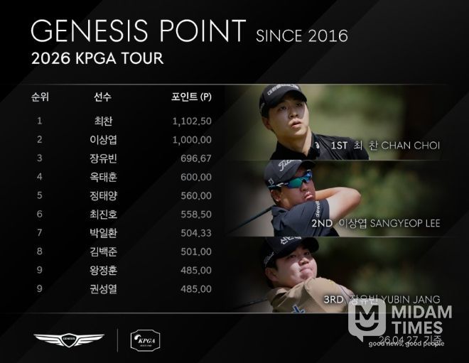 최찬은 ‘2026 우리금융챔피언십’에서 최종합계 13언더파 271타로 우승해 제네시스 포인트 1,000 포인트를 추가한 1,102.50 포인트로 단숨에 제네시스 포인트 1위에 올라섰다. 최찬이 제네시스 포인트 1위에 위치한 것은 2022년 투어 입성 이후 최초다.
