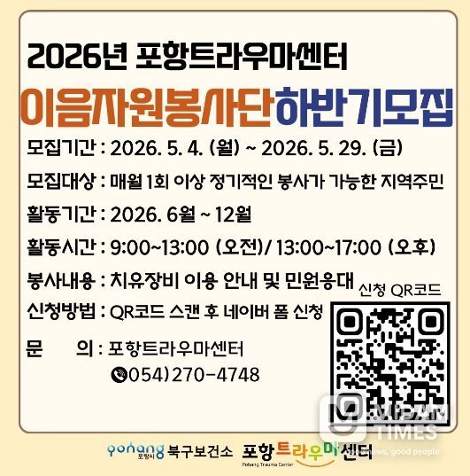 미담타임스 김준완 기자 | 포항시 북구보건소 트라우마센터는 지역사회 재난 및 일상 속 심리적 어려움을 겪는 시민들의 회복을 지원하기 위해 2026년 하반기 ‘이음 자원봉사단’을 추가 모집한다.