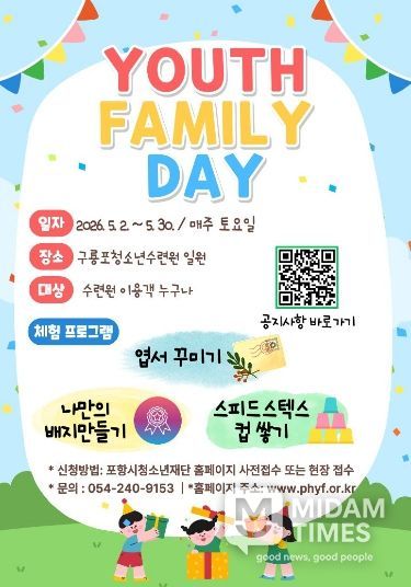 미담타임스 김준완 기자 | 포항시청소년재단 구룡포청소년수련원은 5월 가정의 달을 맞아 청소년과 가족이 함께 참여하는 체험형 프로그램 ‘2026년 5월 YOUTH FAMILY DAY’를 운영한다.