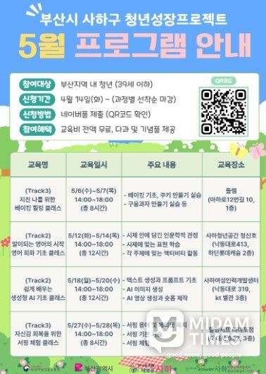 미담타임스 남혜영 기자 | 부산 사하구는 구직 활동에 지친 청년들의 일상 회복과 취업 역량 강화를 위해 '2026년 청년성장 프로젝트' 5월 프로그램 참여자를 선착순 모집한다.