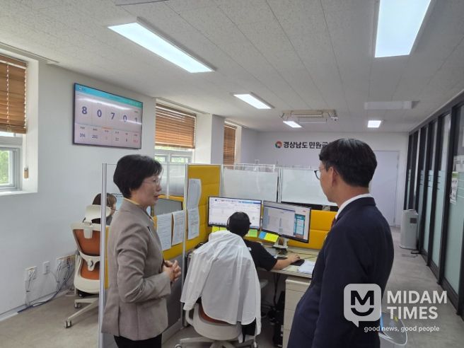 김명주 경남도 경제부지사는 24일 창원시 사림동에 위치한 경남도 민원콜센터를 방문해 운영상황을 점검했다. 경남도 민원콜센터에는 상담원 9명이 근무하고 있으며 일자리, 청년, 보건, 복지 등 797종의 상담 매뉴얼을 갖추고 1일 평균 217건의 민원콜을 처리하고 있다.