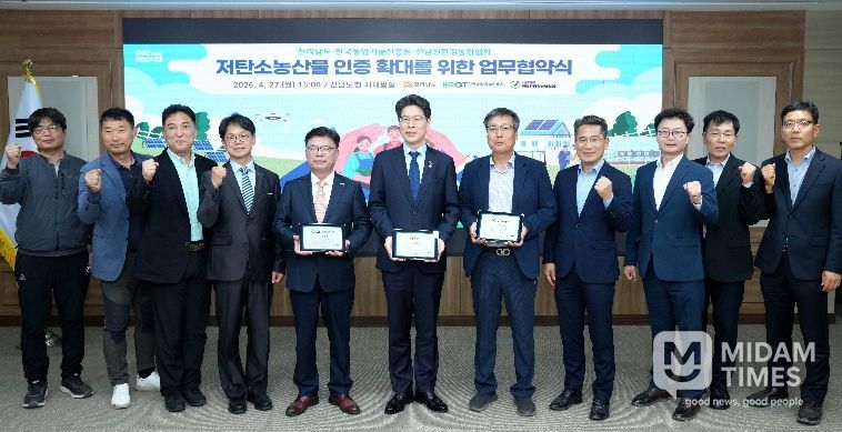 미담타임스 김준완 기자 | 전라남도는 27일 도청에서 한국농업기술진흥원, 전남친환경농업협회와 함께 저탄소 농산물 인증 확대와 탄소 저감 실천을 위한 업무협약을 했다.