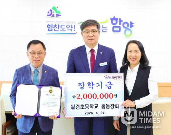 미담타임스 황명수 기자 | (재)함양군장학회는 4월 27일 팔령초등학교 총동창회(회장 박갑열)가 지역 인재 육성을 위한 장학금 200만 원을 기탁했다고 밝혔다.