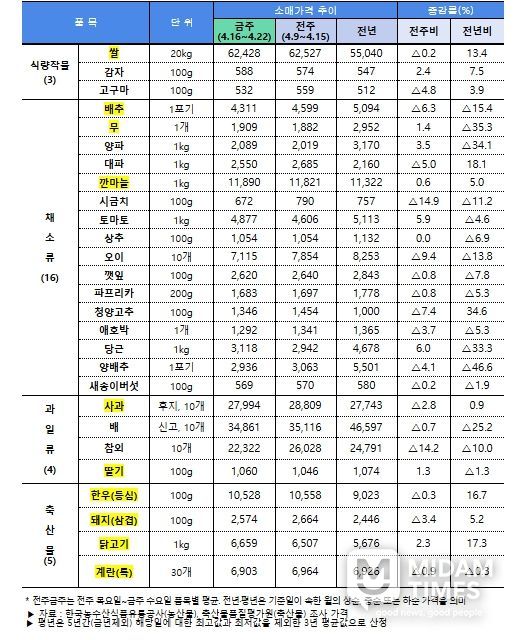 미담타임스 조혜리 기자 | 농림축산식품부는 4월 5주 수급동향 점검 결과, 지난주와 특별한 변동 없이 농산물 가격은 전반적으로 전년 대비 낮은 수준을 유지하고 있는 것으로 나타났다고 밝혔다.