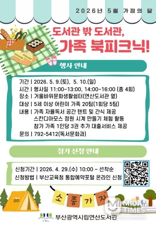 미담타임스 남혜영 기자 | 부산광역시립연산도서관은 다음달 9일부터 10일까지 이틀간 도서관 옆 거울바위문화생활쉼터에서 5세 이상 어린이를 동반한 가족 20팀을 대상으로 ‘도서관 밖 도서관, 가족 북피크닉!’ 행사를 운영한다.